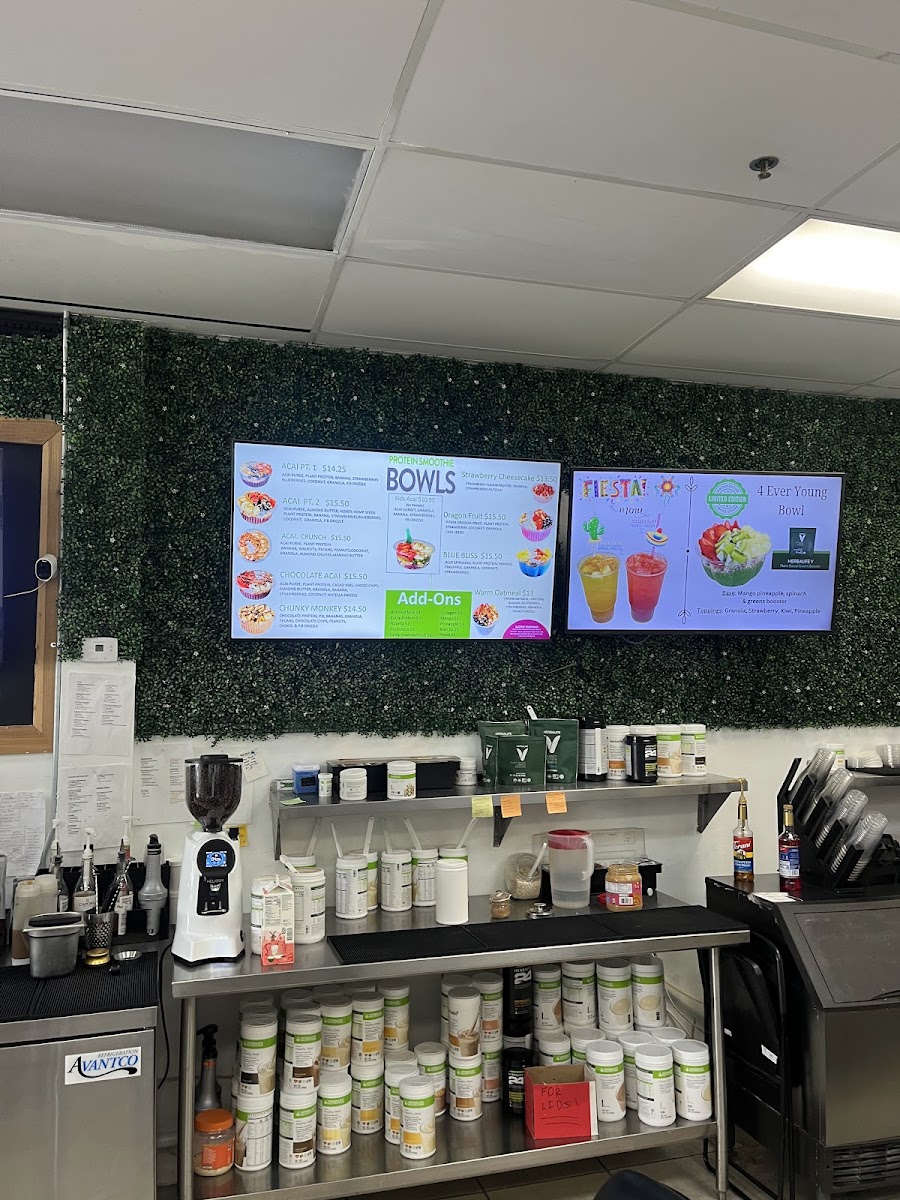 Acai puree, vanilla protein, banana, strawberries blueberries, coconut, and granola, almond chunks. Add almond butter and peanut butter for an additional charge.